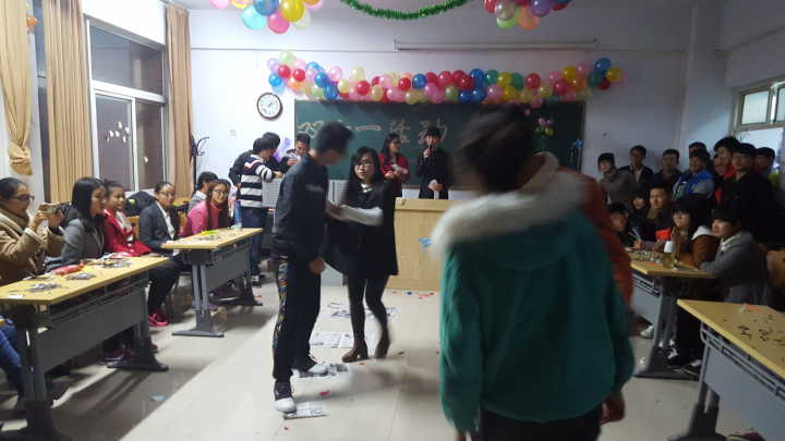 经过主持人简单介绍活动流程后,此次活动正式以“背对背的拥抱”拉开序幕,男女同学通过背部将气球压破,游戏在一声声爆破声和呼喊声中进行着。之后依次进行了“人生之路”、“两人三足”、“你做我猜”、“撕名牌”四个游戏。在《撕名牌》游戏中,男女自由组队参加比赛,男生们像勇士一样紧紧的护着组合中贴有名牌的女生,同时找机会去撕下别的组合的名牌,更是将活动推向高潮。最后,我院学生会主席尤泽楠对本次活动中表现出色的同学颁发了相应的奖品,活动在欢笑中落下帷幕。