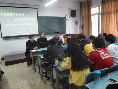 大会上,首先党总支书记黄家骏结合我系迎评促建工作强调了学风建设的重要性,明确了我校评估工作与每位学生都息息相关,希望学生党员干部积极发挥模范带头作用。顾老师宣读了《2014年学风建设实施方案》,要求按照文件做到五个提高、五个减少,希望同学们由“要我学习”转变为“我要学习”。党总支副书记和存龙针对此次学风建设指出了评建工作中经常出现的问题,要求学生党员干部应对身边不良现象引起足够的重视,杜绝不良行为。最后由学生代表易点保发言,各学生党员、干部在倡议书上签字。