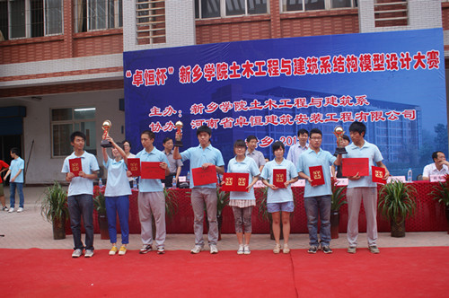 6月20日下午,由我系主办的“卓恒杯”新乡学院土木工程与建筑系结构模型设计大赛在9号楼前厅举行。新乡学院副院长韩先喜、吴中、阎宏斌、郭爱先、刘翔、王选年、纪检委书记张少华和相关部门领导莅临比赛现场观摩指导,河南卓恒建筑安装工程有限公司董事长张子贵先生和总经理陈双虎先生作为来宾到场观看指导比赛。我系全体教师和同学们现场观看了比赛,大赛由我系党总支书记黄家骏主持。
