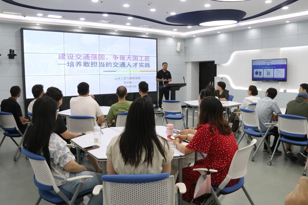 第一场专题讲座,由史纪村博士主讲,主题为《建设交通强国、争做大国工匠—培养敢担当的交通人才实践》。史博士结合我国公路交通的特点,讲述公路交通网络体系在我国经济社会发展中的重大作用,尤其是在实现“两个一百年”奋斗目标过程的重要支撑作用。史博士以路基路面工程课程为依托,介绍如何建立科学的知识体系并培养学生的家国情怀;介绍科研+教学融合共生的经验方法:以为党育人、为国育才为目标导向,以落实人才培养方案为根本,在教学过程中注重培养学生探索能力,引导带领学生参与科研课题,让学生学会学习、成长成才,从而落实立德树人根本任务。