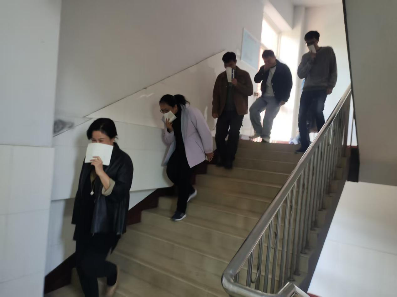 随后教员讲解了应急疏散注意事项。随着警报声响起,参与演练的教师在疏散组成员的指引下,按照预定路线,低头弯腰,用湿毛巾捂住口鼻,迅速有序地撤离到安全区域。整个疏散过程高效有序,演练筹备小组提前清理了疏散通道,确保路线畅通。各楼层负责人迅速到位,引导教师安全撤离。