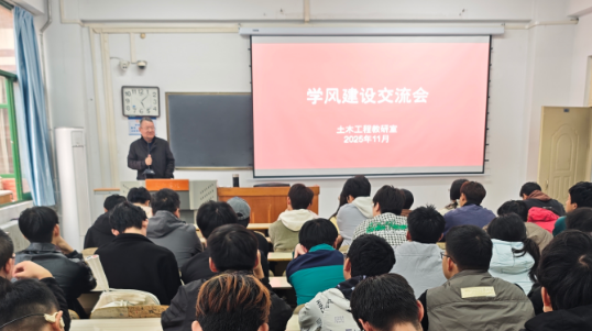 2025年11月4日,土木工程教研室面向2023级土木工程1班全体学生召开学风建设专题交流会。教研室教师代表张永才、辅导员王曦通过专业剖析、数据解读与生涯指导相结合的创新形式,为土木学子注入强心剂。