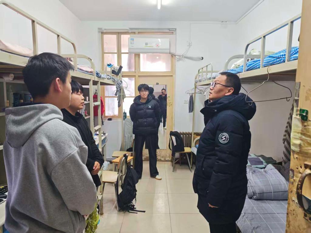 在男生宿舍区,袁大伟副书记一行逐一走访了各楼层宿舍。每到一间宿舍,袁书记都与同学们亲切交谈,详细询问大家的假期生活、返校过程以及新学期的学习计划。在交谈中,袁书记耐心听取了同学们在学习和生活上遇到的困难与建议,并鼓励大家尽快调整状态,以饱满的精神面貌投入到新学期的学习生活中。他还特别强调了宿舍安全的重要性,仔细检查了宿舍内的用电设施,叮嘱同学们要严格遵守校纪校规,杜绝使用违规电器,注意防火防盗,保持宿舍卫生整洁,共同维护良好的住宿环境。辅导员尚奇、王曦、许玲玲则对宿舍人员返校情况进行了仔细核对,并就学业规划、心理健康等问题与同学们进行了交流。